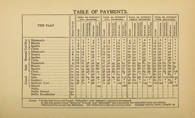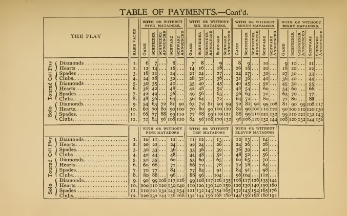 Type 4. The fourth set of tables is taken from an older version of the rules used by the NASL, this one described by J. Charles Eichhorn in his 1898 volume American Skat.