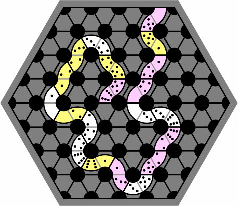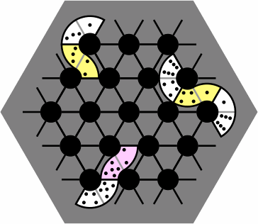 When a tile is placed on the board, its concave side should be touching a black dot, and both its ends should be touching black lines. Figure 5 shows the board with some correctly-placed tiles; no tile ever covers a gray region of the board.