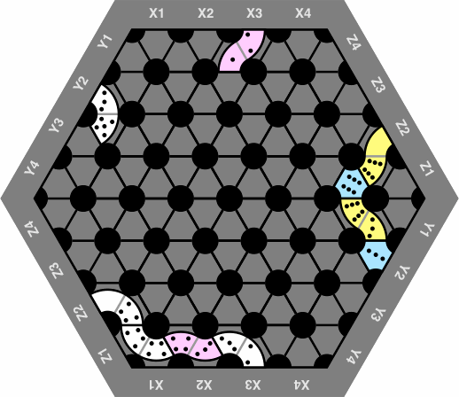 Players who regard the edge of the board as a needless constraint may obtain a closed-edge diagram and wrap around. In figure 23, the 1-2 at the top is adjacent to the 2-3 at the bottom, both at the X3 marking. Similarly, the 6-0 and 0-4 abut via Z2; likewise for 5-3 and the single 3 via Y2. Hence this layout is one long chain.