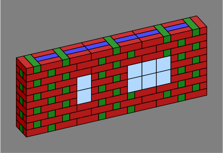 Bricks colored blue are entirely interior to the wall and might be omitted, depending on how strong the wall needs to be. Red and green bricks are mandatory, at least in an ordinary wall; one reason for their color difference is that it makes the diagrams easier to read, and another more subtle reason will be revealed in section 6 below. Although the red, green and blue coloration was adopted for technical reasons, it happens to suggest a decorative pattern for a wall built with multicolor bricks.