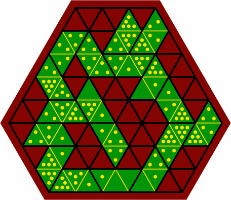 §10. Although dominoes usually have square cells, triangles work equally well. Each cell can easily contain as many as six pips. Although this is less than the nine of square cells, a sesquidomino with three triangular cells is asymmetric, so that a larger number of different tiles with the same number of pips are available.