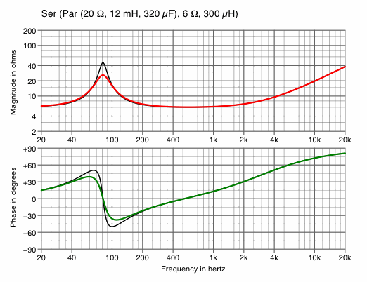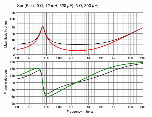 Such charts routinely include the magnitude of the complex impedance, but not the phase. It turns out that for dynamic speakers, the phase is roughly proportional to the derivative [w] of the magnitude, so at least the phase can be estimated. The phase of a dynamic speaker might lie anywhere between −90° and +90°, but amplifiers usually perform best when the phase is between −45° and +45°. Otherwise, the amplifier can be delivering substantial voltage and current, yet little power.The network Ser (Par (40 Ω, 12 mH, 320 μF), 6 Ω, 300 μH) was selected as a benchmark for comparison within this report because it approximates the electrical characteristics of a typical guitar speaker. Its impedance curves are displayed three different ways in charts 1A, 1B and 1C.
