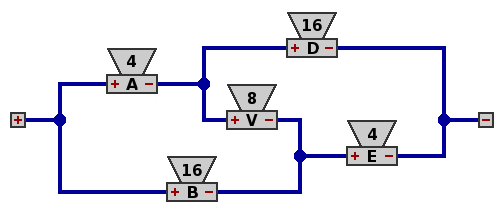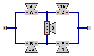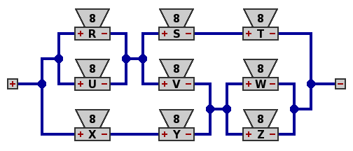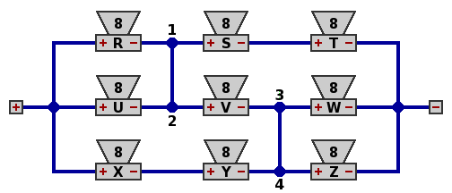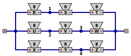 Circuit 1, below, has nine identical speakers arranged into three parallel branches, each containing three speakers in series. Assume each speaker has an impedance of 8 ohms, and is supplied with enough current to be dissipating 10 watts. Easily calculated are that the overall impedance of the network is 8 ohms, and the overall power dissipation is 90 watts.