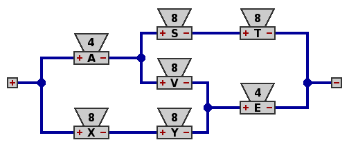 To obtain circuit 5, replace speakers S and T, which are in series, with 16Ω speaker D, which will also dissipate 20 watts. Similarly, replace X and Y with 16Ω speaker B.