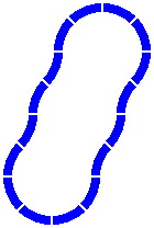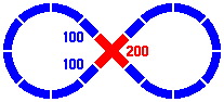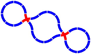 Crossings make possible the next layout, with two disjoint loops; although they intersect, trains cannot pass from one loop to the other. The crossing pieces are the same as in figure 6-6, and the distance between the centers of the two circles is 306mm [= 800 × sin22.5°].