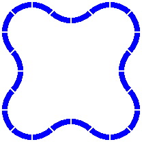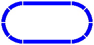 In the diagrams below, crossings are rendered in red, while single-segment pieces remain blue. Figure 6-1 shows a right-angle crossing of two straight segments each of length 400mm. Figure 6-2 is similar, except that the segments within the crossing are shorter, and plain pieces are used to fill the gaps.