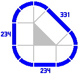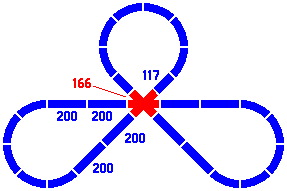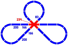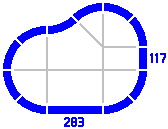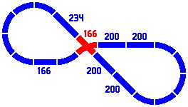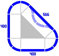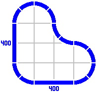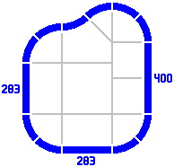 By contrast, the radius of the curves dictates the length of the straight pieces in the figures below. Any combination totaling 400mm will suffice. [The light gray lines are not part of the layout, rather being an artifice to show the alignment of different pieces.]