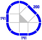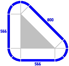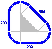§4. The primary series. In some layouts, straight-track lengths in round numbers are not sufficient. Figure 4-1 is a modification of figure 3-2: four curved pieces [rendered in a paler color] have been replaced by one straight track. The gray lines and filled-in triangle clarify that the three straight pieces are equivalent to a right triangle. Its two legs are 400mm long each, and its hypotenuse consequently must be about 566mm long. This last number is 400 times the square root of two, itself approximately 1.414214.