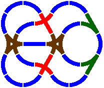 When double-tracked pieces meet, various configurations are possible. In some cases, there is ambiguity about whether coloring in a double-tracking diagram should be blue [for a plain segment] red [crossing], green [switch], brown [crossing plus switch], or some combination of colors.