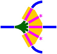 Four instances of this subtle curve are highlighted in green in figure 15-8b. Figure 15-8c reveals that the inner portals lie at uniform 30° intervals. This feature somewhat increases the chance, after one train car has left the turntable, that the disk will be correctly oriented for the next car. The 30° spacing also allows the two disk segments to be assigned to different sets of double tracks, as in figure 15-8d. [The turntable of figure 14-11 also has 30° spacing in part, but the segments are aligned on the turntable differently.]