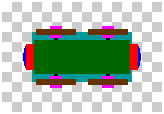 Each of the gray and white blocks throughout the background is a 5mm square, and the same scale is used throughout this page except where marked otherwise. Colors designate different parts of the cars: