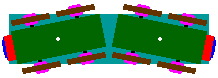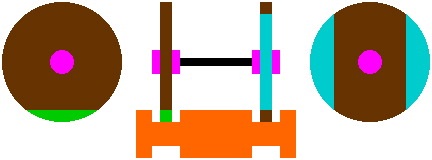 The overhead view of figure 5-b or 5-e might suggest that the entire diameter of the wheel must fit into the groove on a curve, yet this is not the case. Figure 6 clarifies the matter. If the groove is 3mm deep, only the bottom 3mm of the wheel (bright green) need fit into it. On a sharp curve, certain portions (bright cyan) might without harm hang over the curb or median; this is more likely to happen if wheels are of larger diameter. Figure 6-a has the usual wheel of 20mm diameter encountered in the examples so far. Figure 6-b in contrast shows a 30mm wheel, which is sometimes found on locomotives.