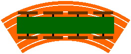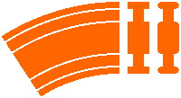 Figure 3 shows, in overhead view and two cross sections, a curved track having a radius (to its centerline) of 100mm, which is the practical minimum for toy trains of this genre. Measuring 40mm wide and 12mm thick, each face of the track consists of: