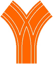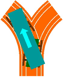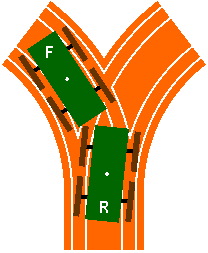 When an car with an articulated frame heads into a switch (figure 5-c), there is a risk that the two member frames might go different directions. This is shown in figures 5-d (with car body) and 5-e (without), where a train car is moving from bottom to top. The front frame (marked 'F') turns to the left, but the rear frame ('R') wanders toward the right. In practice, this problem is virtually eliminated by limiting the horizontal angle through which a frame may rotate, relative to the car body, to roughly 10°. An alternate remedy is to use a switch that has moving parts to guide the wheels.