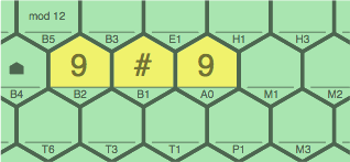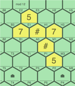 Continuing with a modulus of 12, figures 7C, 7D, and 7E below show how a wild tile ambiguity might be resolved by a broader context. Of interest is cell A0.
