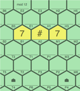 §7-3. Figure 7B, with a modulus of 12, displays an ambiguity, as cell B1 could legally contain either a 3 or a 9. Under optional rule E, the player who installs the wild tile does not declare what number it stands for, instead allowing the uncertainty to remain for an indefinite amount of time. Later, if some player later installs a 3 on cell M1, then B1 will have to be regarded as a 3 (M12-S6-A3); if instead M1 gets a 9, B1 must stand for a 9 itself (M12-S0-A9).