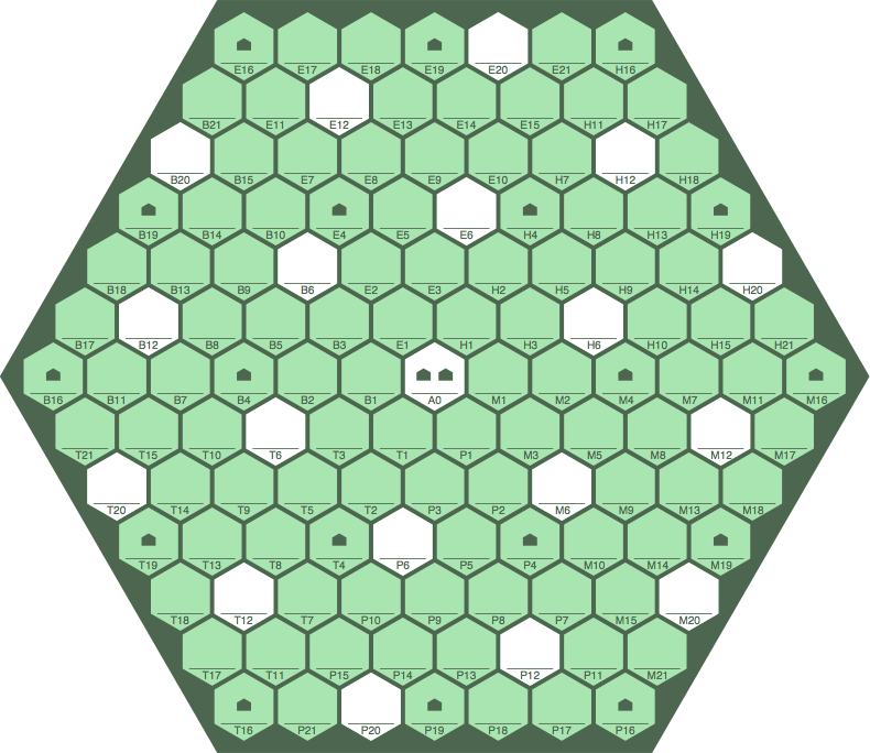 Bonus cells have the numbers 0, 6, 12, and 20 in their addresses, the same in all sextants of the board. The pattern extends to higher-order boards which would use the numbers 22, 32, 43, 48, 55, 61, 68, 75 as needed.