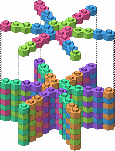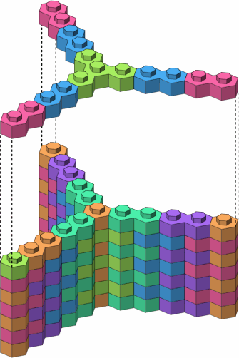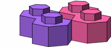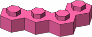 Figure A-1 shows the two smallest bricks in a hexagonal system, bearing one and two studs respectively, the studs being the hexagonal projections on the tops of the bricks. These two bricks are the minimum for any serious construction. When a wall is formed by stacking bricks, each stud is gripped by a socket in the bottom of whatever brick is on top of it. There is enough friction in the fit to make accidental dislodging unlikely, but not so much as to prevent intentional disassembly.