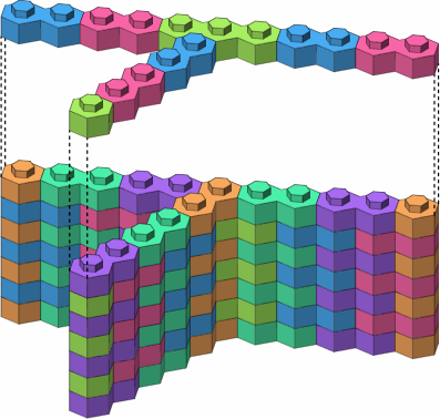 If a brick of the type so far presented is only one stud wide, as the purple brick in figure C-3, a brick plugged in underneath it will have no opportunity for out-of-phase placement. However, out-of-phase connection becomes possible with the beams of figure B-1, because they are at least two studs wide. The smallest brick enabling out-of-phase assembly is the three-stud triangle of figure A-3.