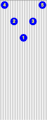 5 pins are arranged in a vee, at a center-to-center distance of 12 inches, their positions numbered for reference. The lane, 29½ inches wide, would be constructed of 27 boards each slightly more than one inch wide. The length of the lane is as desired. |
