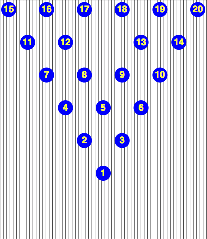 The numbers work out most elegantly in the 10-pin and 15-pin versions, and that is why they got treated on the main page. As for the 5-pin and 20-pin versions, some players may choose to fill the gap in the triangular arrangement of the pins, obtaining perhaps: