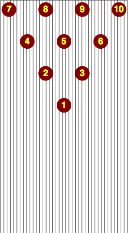 10 pins are arranged in a triangle, at a center-to-center distance of 12 inches, their positions numbered for reference. The lane, 41½ inches wide, is traditionally constructed of 39 boards each slightly more than one inch wide. The length of the lane is 60 feet from foul line to the center of the number-1 pin. Additionally, there is an approach area at least 15 feet long of the same width as the lane. |
