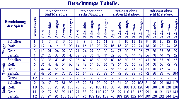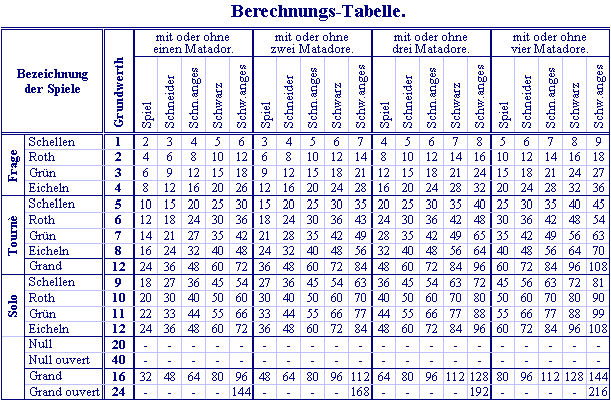 Tables of Skat bidding values.