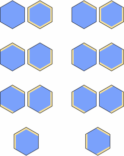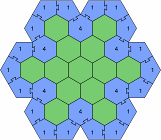 | There is little practical choice in how to arrange the frame pieces of figure A. Figure B, however, is an equivalent layout introducing two styles of primitive frame pieces, six labeled 1 and twelve labeled 2; the idea is to extend the hexagonal pattern as far as feasible. Some of the Catan expansion sets include pieces similar to frame piece 2.