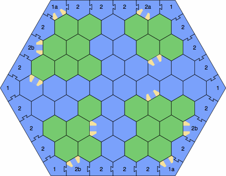 | Some of the Catan expansions such as Seafarers use a much larger playing area, with several islands containing resources and deserts. Between them is water (blue) for ships to cross. As with the original game, the factory does not resolve all the pieces into primitives, but figure Q shows how a typical layout would be done. Shorelines are no longer drawn, for the reason given in figure R.